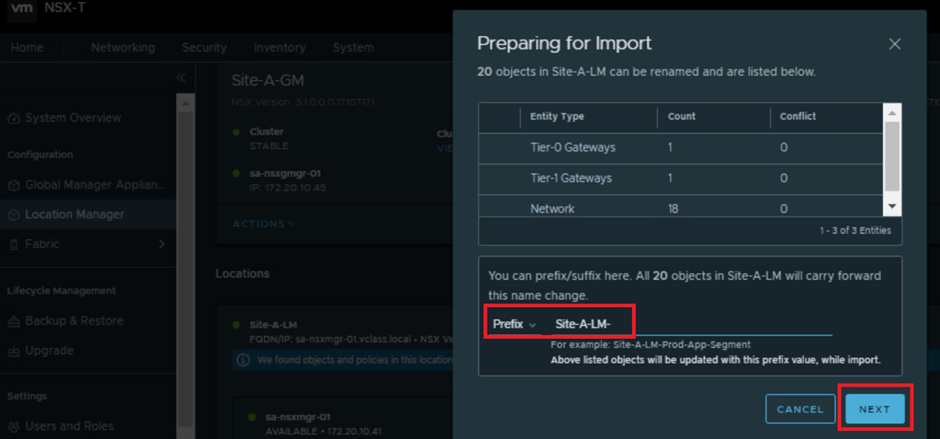 At this point we can see all the existing local configuration like, number of Tier-0 , Tier-1 & networks which will be imported to GM.