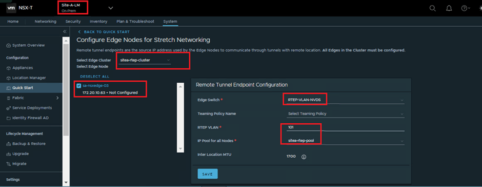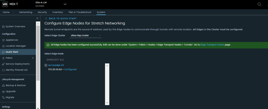 This step leads you to the Site-A Local Manager (Site-A-LM) at System > Quick Start > Configure Edge Nodes for Stretch Networking.