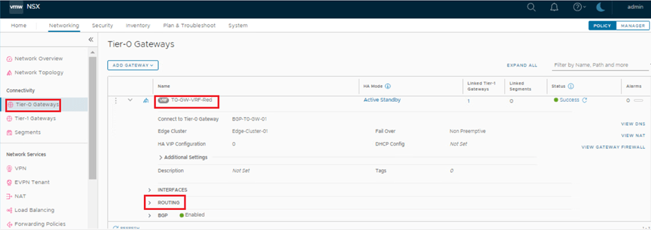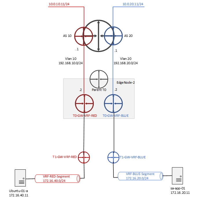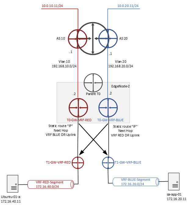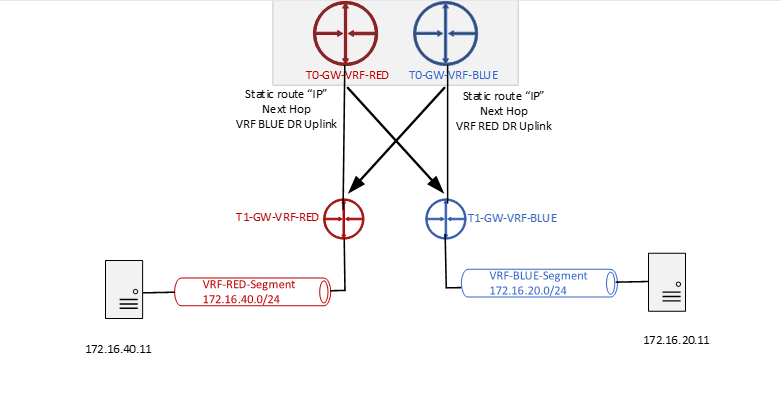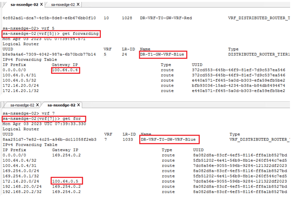 • 172.16.20.11/32 (VRF Blue VM) > Next hop > 100.64.0.5 (DR Uplink VRF-Blue-Tier-1) with scope – VRF Blue