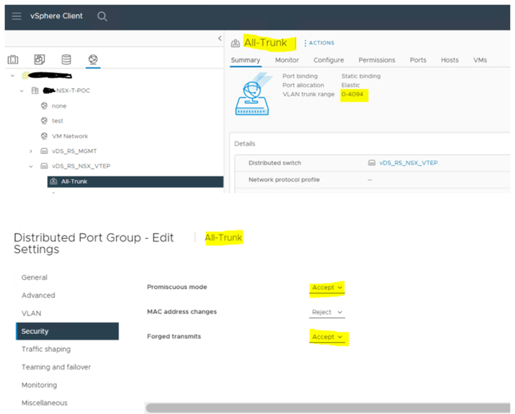 - Turn on Promiscuous port & forge transmit ON for ALL-Trunk-port-group which we have used for edge nodes uplink during our base-build configuration.