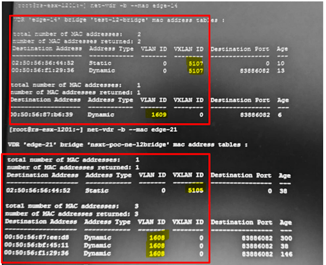 MAC learning Validation – Logged in to ESX where DLR resides to check on MAC address learning.