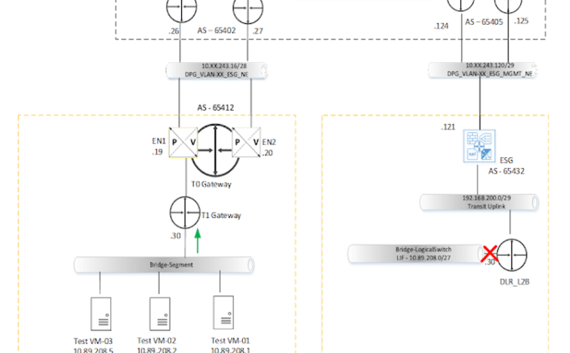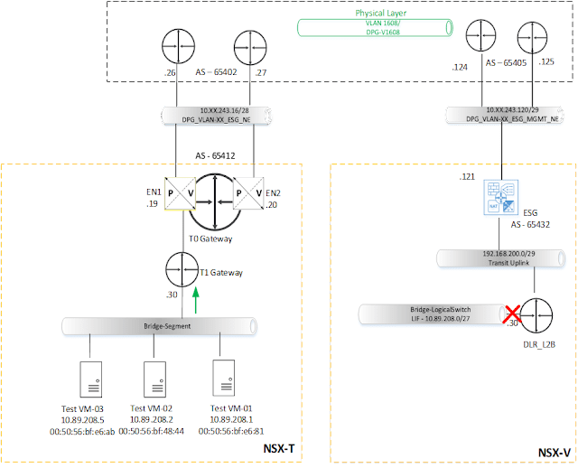 - Physical VLAN which is being used for L2Bridge must be trunked on NSX-T as well as NSX-v hardware/ESX interfaces, where your servers/VMs & DLR (used for L2bridging) resides.