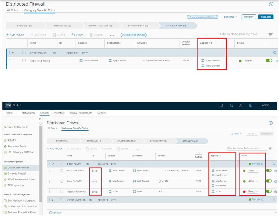 All the current communication is happening via Default rule, which we can be validated via traceflow tool, where we can see Web to App traffic is getting hit on rule-id number 2, which is Default rule in DFW, screenshots attached for reference.