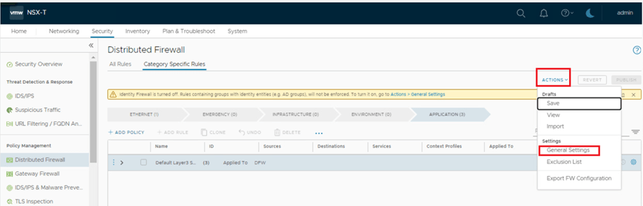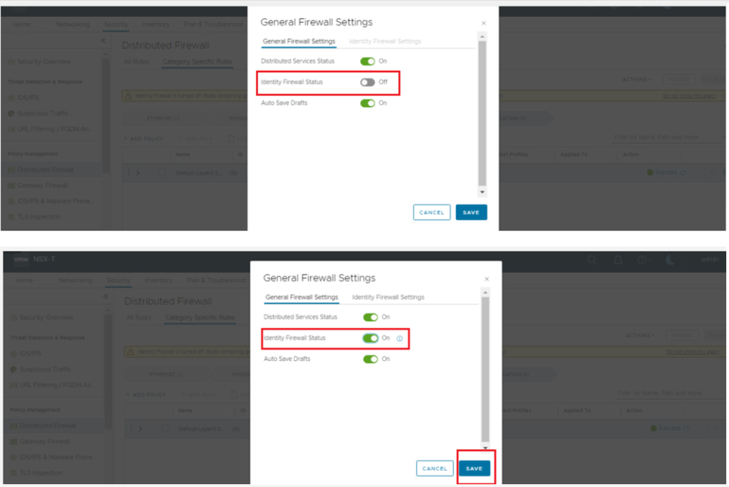Security > Distributed Firewall > Actions > General Settings > Identity Firewall Status > ON