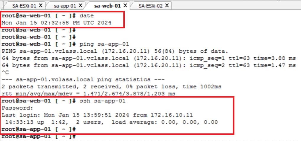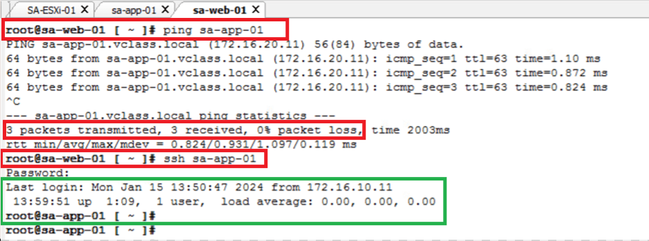 - Connectivity before “Reject SSH time window” starts – we can see that sa-web-01 machine is able to ping as well can SSH sa-app-01 machine.