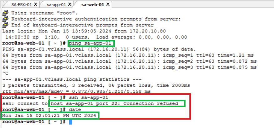 - Connectivity during “Reject SSH time window” – we can see that sa-web-01 machine is able to ping sa-app-01 but no longer SSH.