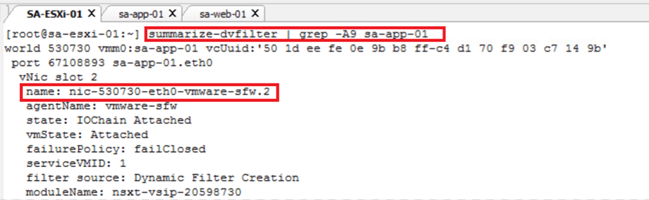 - summarize-dvfilter // to check dfw rules on particular vmnic / .vmk