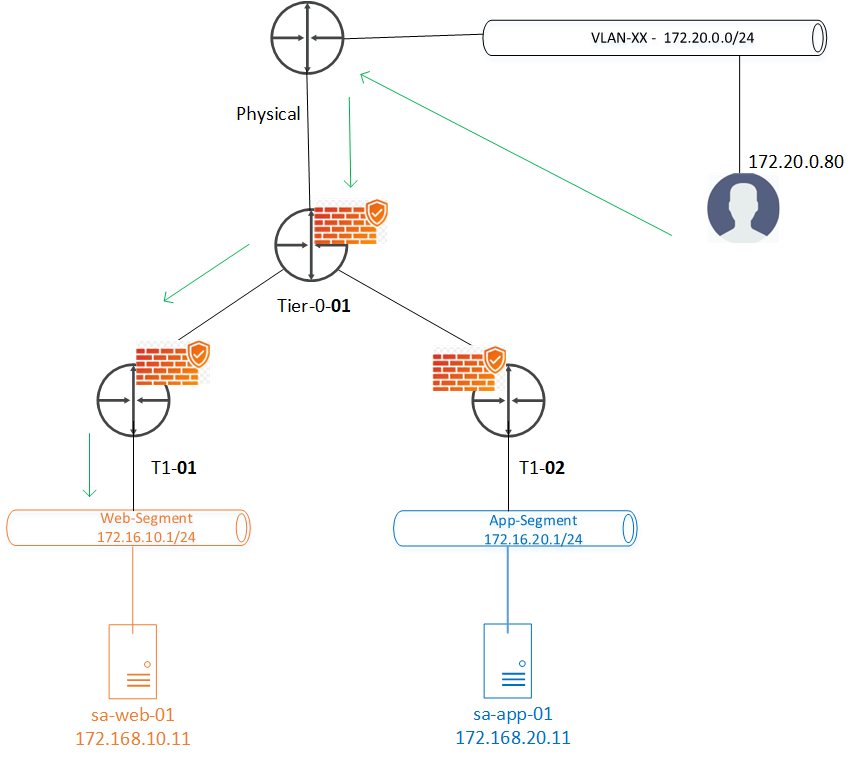 - Two gateway firewalls Tier-0-01 & T1-01 come in picture for the given N-S communication shown above in the topology diagram.