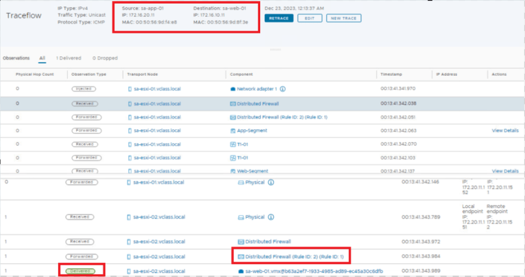 - Trace is getting passed via Tier-1 Firewall and Tier-0 Firewall.