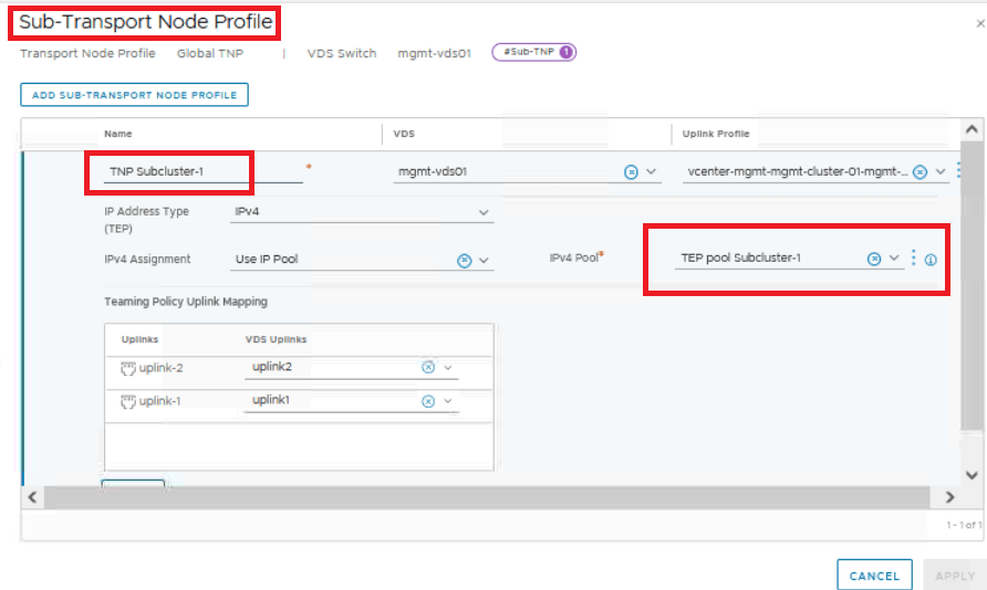 Now lets test one more piece, lets make ESXi-1 part of Sub-Cluster-1, expectation is it should change its TEP IPs from parent TEP pool to Sub-cluster-1 TEP pool.