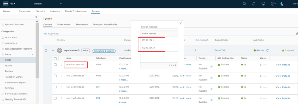 TEP IPs for ESXi-1 has change to Sub-cluster-1 TEP pool now.