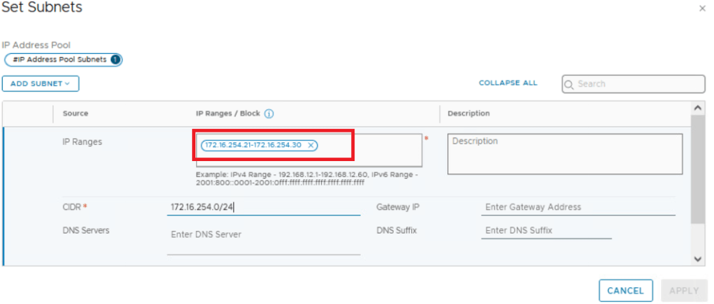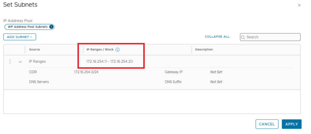 Lets explore this option in LAB, here i am going to use a bigger IP pool & going to split it into other 2 subcluster IP pool, then we will prepare 1 node with first sub-cluster IP pool & other 1 node with subcluster IP pool & remaining 2 nodes with parent TEP IP pool, so we are going to prepare 4 nodes cluster with 3 different TEP pools.
